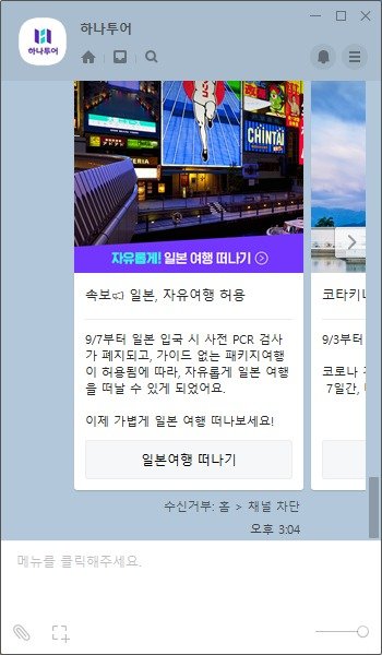 하나투어가 지난 5일 카카오톡 플러스 회원 대상으로 보낸 마케팅 메시지한국과 일본 정부가 코로나19 이후 해외 입국자에 대한 규제를 완화하면서 국제 관광에 대한 관심이 높아지는 가운데, 한일간 관광 교류 정상화에 대한 기대감이 조심스레 나온다.