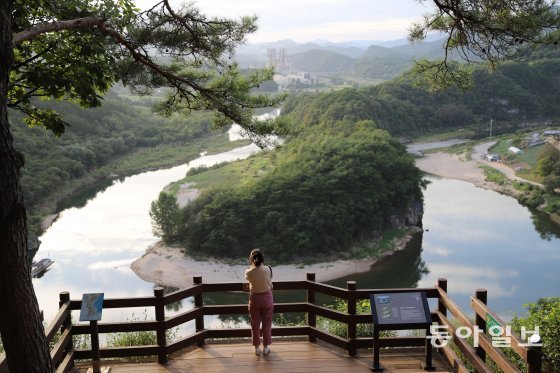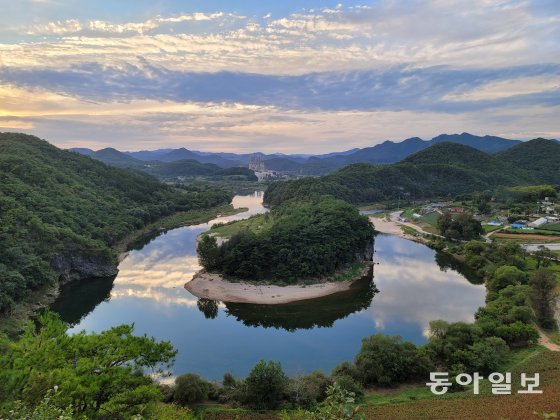배를 타고 한반도를 한바퀴 돌았다면, 이번에는 산 위에서 내려다볼 차례다. 주차장에서 산길을 오른지 약 20분. 가이드가 ‘제주 성산봉’이라고 설명한 전망대에 도착하니 노을빛이 비친 강물 위에 한반도가 떠 있다. 모양만 닮은 게 아니라 ‘동고서저(東高西低)’ 지형까지 닮았다. 동쪽에는 태백산맥처럼 숲이 우거져 있고, 서쪽엔 낮고 평평한 풀밭과 모래사장이 형성돼 있는 것이 영락없는 한반도다.