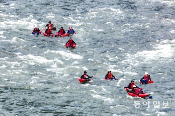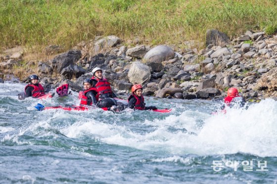 ‘동강 리버버깅’은 영월군 김삿갓면 각동수련장에서 출발한다. 2시간에 걸쳐 급류를 타다보면 4km 떨어진 단양까지 흘러간다. 수련장 앞 강변에서 먼저 약 20분간 안전교육이 이뤄졌다. 특히 급류에 기구가 뒤집어졌을 때 다시 올라타는 법을 실습하는 게 필수. 튜브처럼 생긴 기구는 어린이나 여성도 쉽게 올라탈 수 있었다.