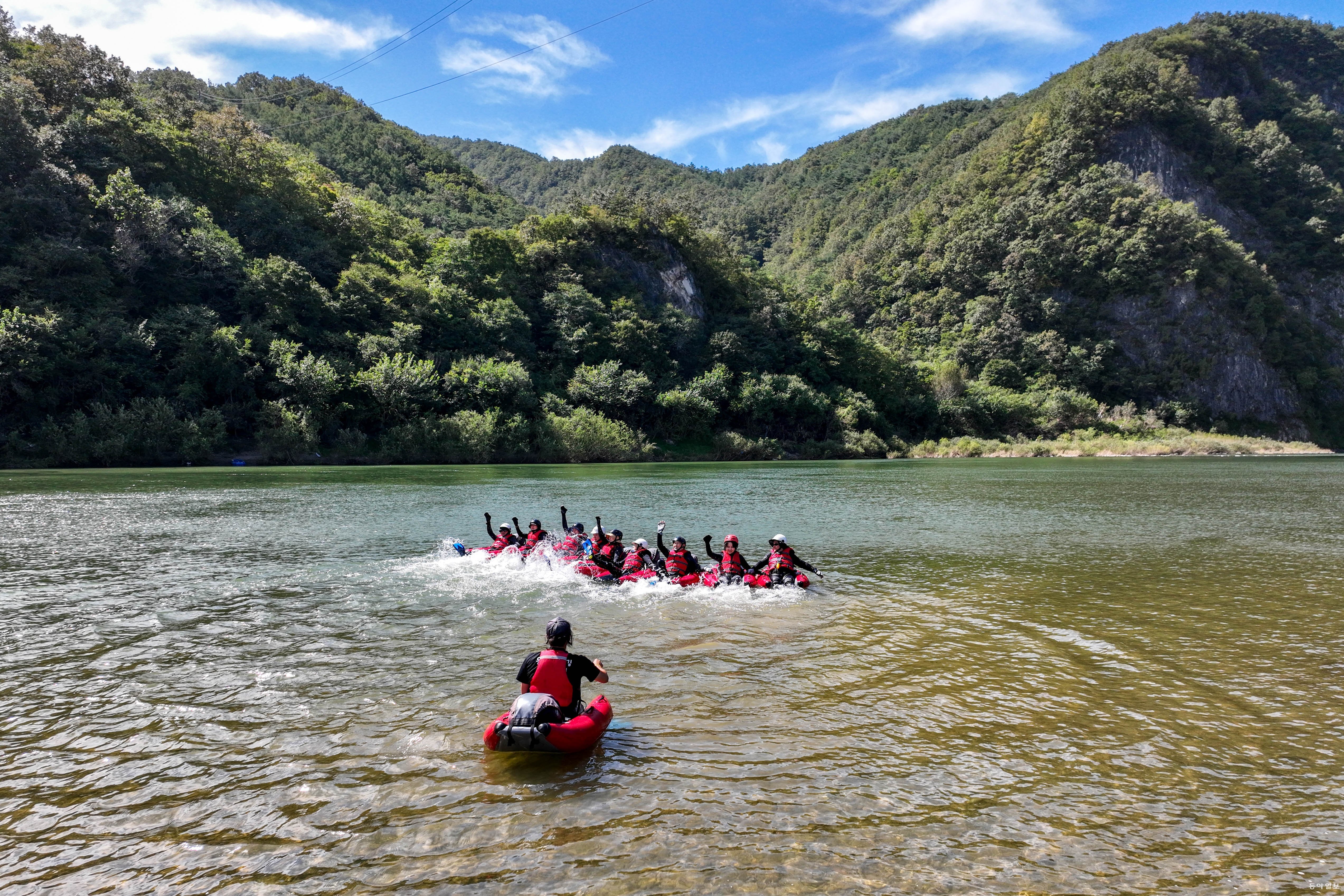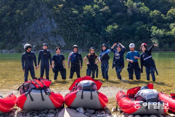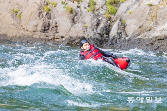 드디어 출발! 첫 번째 급류에서 긴장을 한 탓인지 균형잡기가 쉽지 않다. 두 번째 급류는 한층 물살이 세져 롤러코스터를 탄 듯 위아래로 요동을 친다. 마지막 세 번째 급류 코스는 앞이 안 보일 정도로 하얀색 물보라가 온 몸을 때린다. 심장이 쫄깃쫄깃, 짜릿한 기분에 환호성과 비명이 교차한다. 드디어 도착지점. 강물이 잔잔해지자 구명조끼를 입고 동강 물에 풍덩 뛰어든다. 물 위에 누워 하늘을 보며 천천히 흘러간다. 동강의 절경을 눈과 마음에 담는다.