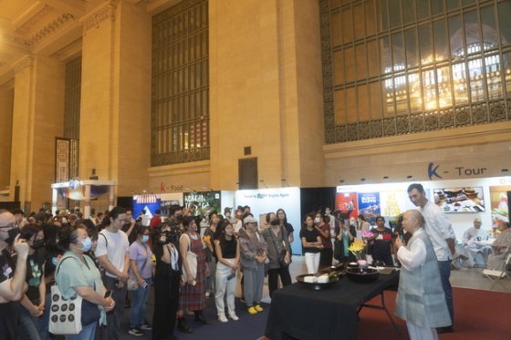 지난 8월22일 뉴욕에서 한국문화관광 페스티벌에서 정관스님의 사찰음식 소개하는 모습(한국관광공사 제공)한국관광공사는 미국, 캐나다, 영국, 독일에서 비건(채식주의)여행 전문상품 개발 여행사 관계자와 유력 인플루언서들이 서울과 순천 등지에서 비건 맞춤형 팸투어에 참여하기 위해 방한했다고 12일 밝혔다.