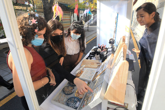 14일 오후 서울 종로구 서순라길 일대에서 열린 ‘제1회 K-주얼리 종로 페스티벌’에서 외국인 관광객들이 상품을 살펴보고 있다. 2022.10.14 뉴스1 ‘한국~대만’간 노선도 이르면 11월 이내로 증편 움직임이 본격화될 전망이다. 중화항공의 경우 ‘인천~타이베이’ 일 2회, ‘김포~송산’, ‘인천~가오슝’ 노선의 복항을 준비하고 있다.