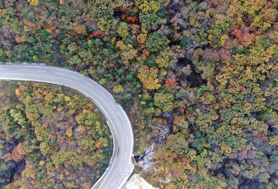 설악산의 단풍이 절정에 달한 22일 한계령과 국도 44호선은 절경을 즐기려는 행락 차량들이 대거 몰렸다. 국도 44호선 한계령 구간은 국내 대표 ‘단풍 로드’ 중 하나다.