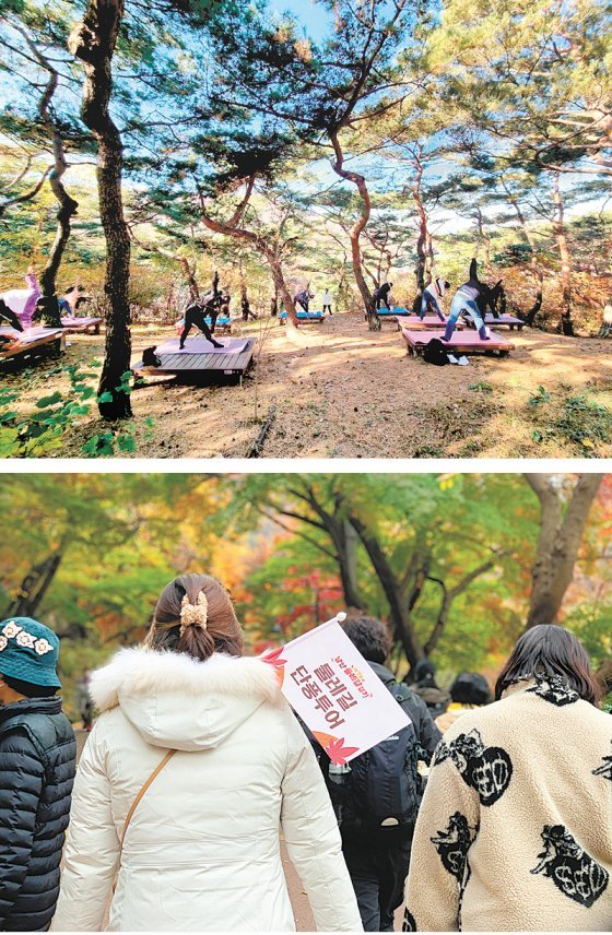둘레길에서 요가(윗쪽)와 걷기 투어를 즐기는 시민들의 모습.또 남산 속 비밀 공간인 ‘소나무 힐링숲’에서 즐기는 산림치유 요가 클래스도 열린다. 아이들과 함께 둘레길을 찾는 가족 단위 방문객이라면 ‘신나는 유아숲놀이’ 프로그램에 참여할 수 있다.