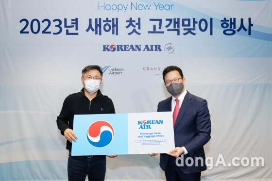 대한항공은 1일 인천국제공항 제2여객터미널에서 ‘새해 첫 고객맞이 행사’를 진행했다. 대한항공을 이용해 새해 처음으로 국내에 입국하는 승객을 환영하는 행사다. 코로나19 팬데믹(세계적 대유행) 여파로 지난 2020년 1월 1일 이후 중단됐다가 올해 3년 만에 재개한 행사다.
