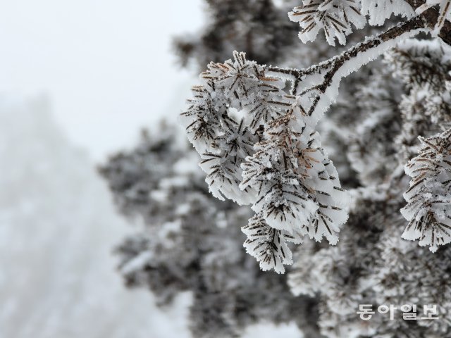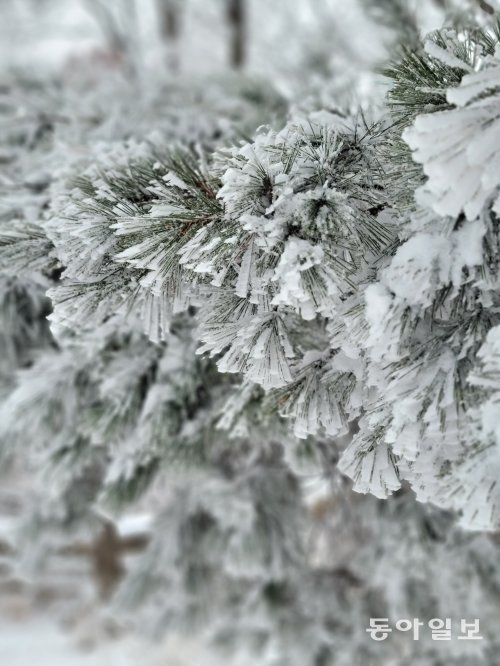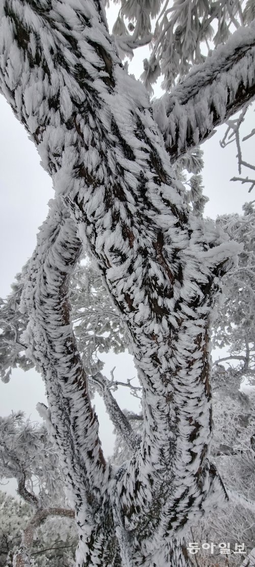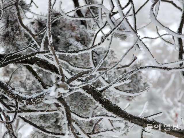 ‘상고대’는 눈꽃이 아니다. 나뭇가지에 눈이 쌓여 생기는 눈꽃과 달리 상고대는 공기 중에 수증기가 얼어붙은 서리꽃이다.