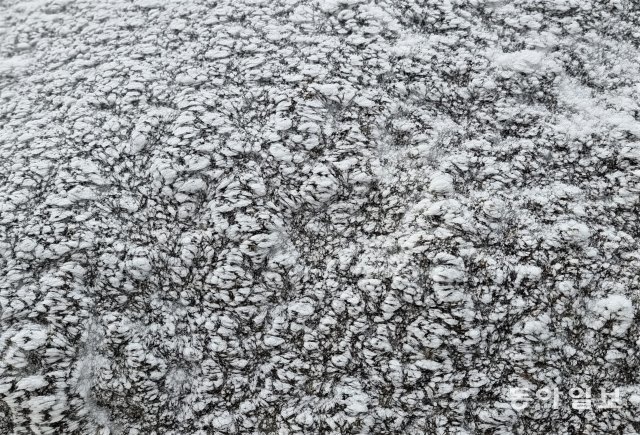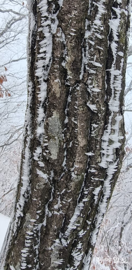 바람에 눈가루가 날려 상고대에 붙으면 점점 두꺼운 상고대로 발달한다. 차가운 바람의 결이 만들어낸 상고대의 얼음은 물고기의 지느러미나 새우의 꼬리처럼 물결을 친다.