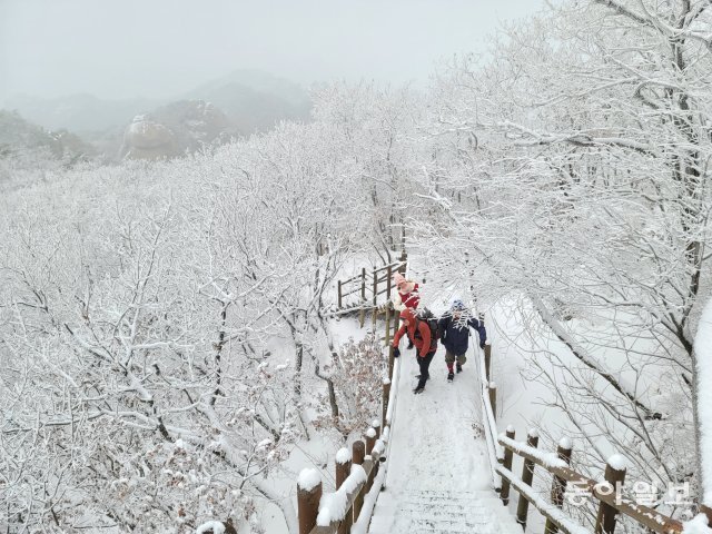 포근한 날씨에 도심에서는 전날 내린 눈이 모두 녹았으나, 도봉산 입구에서부터 눈은 그래도 쌓여 있다. 높이 올라갈 수록 나뭇가지가 얼어붙어 그야말로 겨울왕국을 만들어냈다.