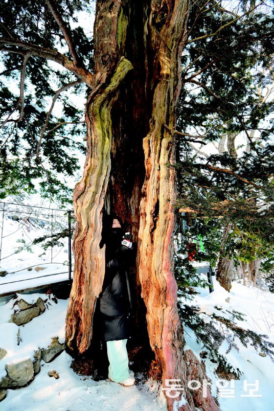 발왕산 천년주목숲길에 있는 ‘고해 주목’. 텅 빈 몸통 안에 나 홀로 들어가 나무에 폭 감싸일 수 있는 공간이 있다.