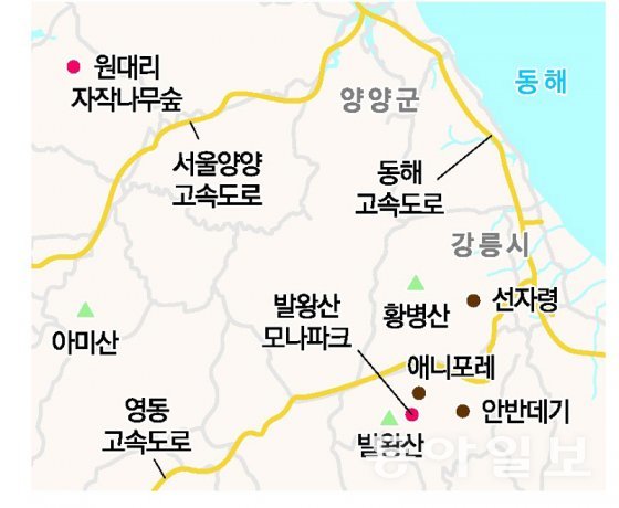 강원 평창군 대관령면 발왕산(1458m) 모나파크 정상은 케이블카를 타면 15분이면 도착한다. 이곳에는 수령 1000년이 넘는 잘
