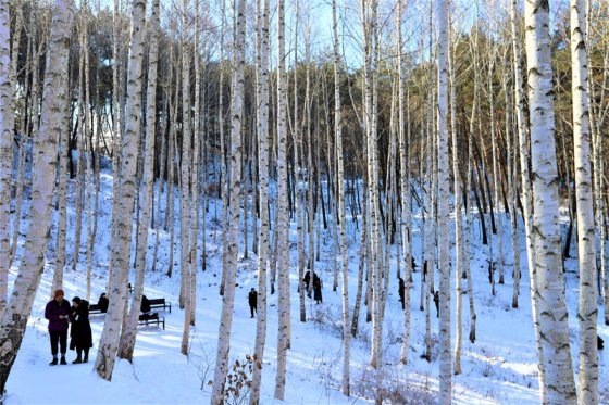 자작나무숲에 가려면 주차장에서 내려 약 3,5km 임도를 걸어야 한다. 눈이 와 있는 요즘에는 등산화와 아이젠이 필수다. 입구에서 1시간 쯤 걸으니 자작나무 숲이 나타났다. 눈부신 수피가 뿜어내는 은(銀)세계. 하얀 눈밭에 하늘을 찌를 듯 서 있는 자작나무 군락의 첫 느낌은 포근함이었다. 숨어들기 좋은 숲이다. 자작나무의 수피에는 일정한 간격으로 무늬들이 있다. 산모양, 호미모양, 달팽이 모양…. 처음엔 상처처럼 보였는데 나무의 입처럼 느껴졌다. 바람이 불자 자작나무 숲에 있는 수백그루의 나무들이 입을 벌려 나지막히 속삭였다. 자작나무 숲에서 따뜻함과 포근함을 느꼈던 이유는 이 때문이었다.