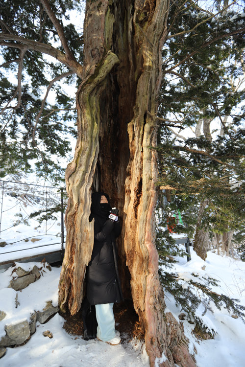고개를 숙여 몸을 낮추고 지나가야하는 겸손의 나무. 오래된 주목의 텅빈 몸통에는 다른 나무의 생명이 싹트는 경우도 많다. 성인 세 명이 안아야 감쌀 수 있는 둘레 4.5m의 ‘어머니왕주목’의 몸통 한 가운데에는 마가목의 가지가 삐쭉하게 뻗어나와 있다. 마치 나무가 출산하고 있는 장면처럼 보인다. 어머니왕주목은 작은 마가목을 품에 안고 키운다.