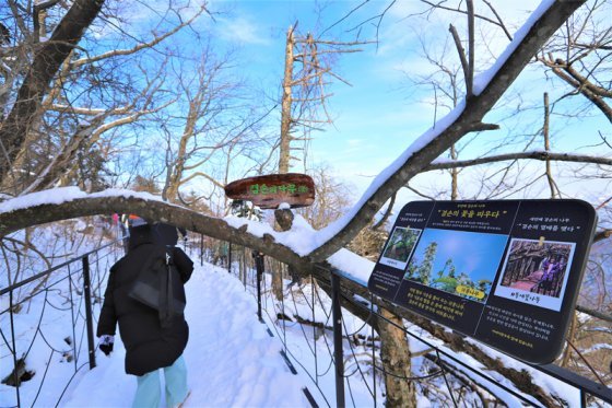 발왕산 천년주목숲길. 발왕산모나파크 제공발왕산에는 또다른 명품 겨울숲이 있다. 발왕산 애니포레에 있는 독일 가문비나무 숲이다. 애니포레는 울릉도에서 산나물이나 고로쇠물을 채취할 때 쓰는 작고 느린 모노레일을 타고 올라간다.