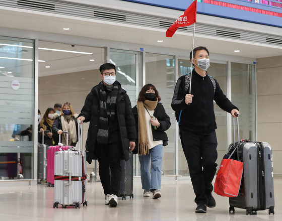 신종 코로나 바이러스 국내 확진자가 24명으로 늘어나 확산 우려가 커지고 있는 7일 오후 인천국제공항 제2터미널로 마스크를 쓴 관광객들이 입국하고 있다. 2020.2.7/뉴스1 ⓒ News1중국인 단기비자 발급이 풀린 가운데 국내 관광업계는 “넘어야 할 산이 많다”며 신중한 입장이지만 상반기 내 중국 방한 시장이 회복세에 접어들 것으로 기대하고 있다.