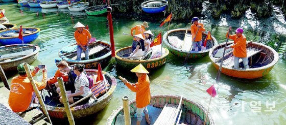 코코넛 배’로 불리는 베트남 호이안의 전통 바구니 배.바구니 배 체험은 전 세계에서 찾아온 관광객들로부터 인기를 끄는 투어 상품 중 하나로 꼽힌다. 한국인 관광객들이 단체로 찾아오면 한국의 트로트 노래로 강변이 떠들썩해진다. 물길을 따라 코코넛 배들이 모여드는 지점에서 노래방 기계로 트로트 가요를 열창하는 현지인 사공을 보면 호주머니에서 팁이 저절로 나간다. 자신들의 전통 문화와 외국 문화를 접목해 관광 상품화시킨 노력이 돋보인다.