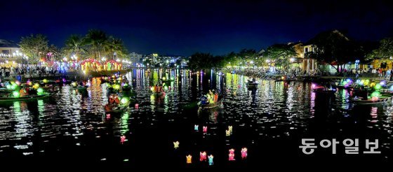 호이안 올드타운을 적시는 투본강은 밤이면 관광객들이 띄운 ‘소원 꽃등’과 풍등을 단 작은 나룻배들로 빛의 향연을 이룬다.《베트남 중부 꽝남성 호이안시는 한국인들이 즐겨 찾는 다낭시에서 남쪽으로 30km 떨어진 곳에 있다. 그런데 이웃한 두 도시 치고는 성격이 너무 다르다. ‘경기도 다낭시’라고 불릴 만큼 한국 분위기가 짙은 다낭에서 아쉬움을 느낀 여행객들도 호이안에 가면 비로소 진짜 베트남을 보았다며 즐거워한다. 베트남의 옛 도시 풍경과 전통 놀이, 고즈넉한 분위기를 체험할 수 있기 때문이다.》