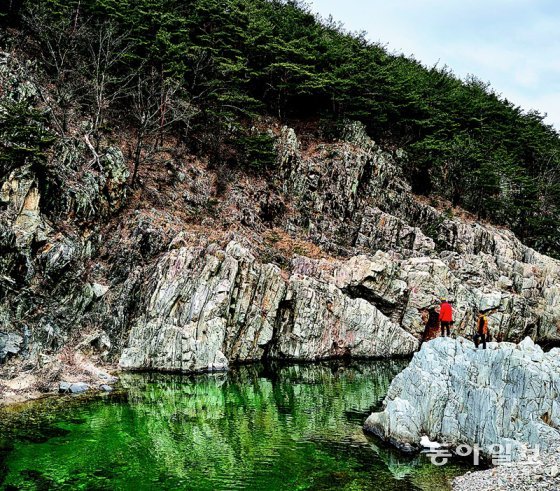 왕피천 생태탐방 트레킹 중 만나게 되는 굴구지 마을의 청암정 계곡.울진은 바다뿐 아니라 멋진 계곡들로도 유명하다. 그중 국내 최대 규모 생태경관보전지역인 왕피천이 대표적이다. 왕피천(65.9km)은 경북 영양군 수비면에서 발원해 울진군 금강송면과 근남면을 거쳐 동해로 흘러나가는 하천이다. 하천을 따라 깊은 산과 기기묘묘한 절벽과 바위들이 펼쳐지는 이곳에서는 하늘다람쥐, 산양, 수달 등 포유류 14종, 조류 60여 종, 양서류·파충류 23종이 서식한다. 물론 동해로 떠났다 돌아오는 은어도 만날 수 있다. 희귀한 동식물이 서식하고 있어서 2013년 환경부로부터 전국 12곳 ‘생태관광지역’ 중 하나로 선정됐다.