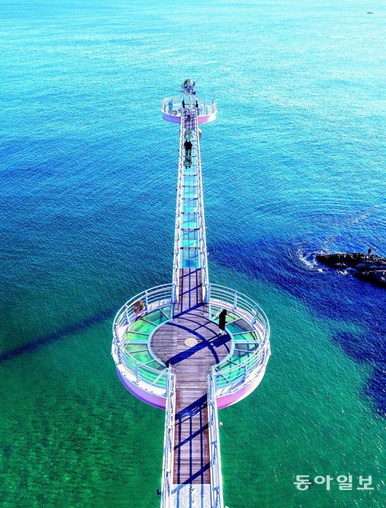 바다 위로 57m 뻗어나간 해상 교량인 ‘등기산 스카이워크’. 투명한 강화유리 아래로 내려다보이는 바닷물은 짜릿한 느낌을 준다.