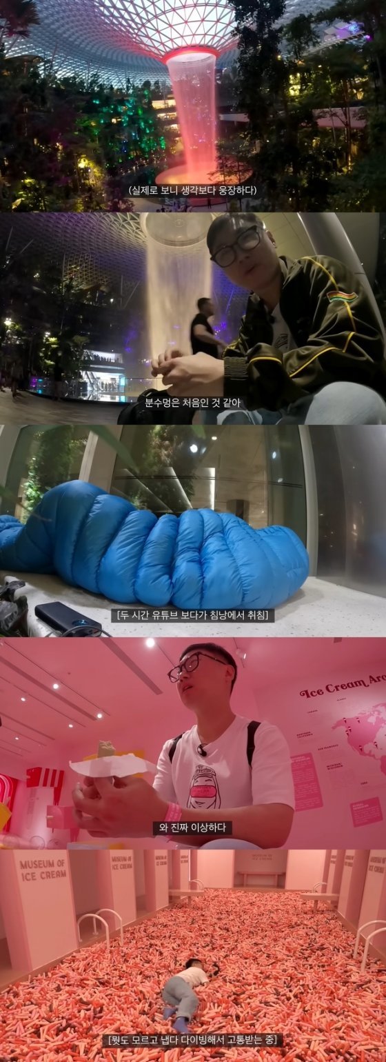 유튜브 지구마불 캡처또 그는 여행의 볼거리도 놓치지 않으려 창이 공항에서의 핫스폿도 찾아 보는 이들을 감탄하게 했다. 세계 최대 규모의 실내폭포가 쏟아지는 분수를 배경으로 승무원이 선물로 건넸던 과자와 남은 기내식 빵으로 저녁을 해결하며 시간을 보냈다. 이후 빠니보틀은 공항에서 적절한 잠자리를 찾아 침낭을 깔고 노숙을 했고, 다음날이 돼서야 약간의 교통비를 지출하고 시내로 향했다. 특히 그는 ‘황금열쇠 미션’인 ‘원지 곽튜브가 정해준대로 여행하기’ 미션을 위해 박물관을 필수로 찾아야 했다. 디저트까지 일석이조로 만족할 수 있는 아이스크림 박물관을 캐리어를 끌고 힘겹게 방문, 다채로운 아이스크림 먹방도 선보였다.
