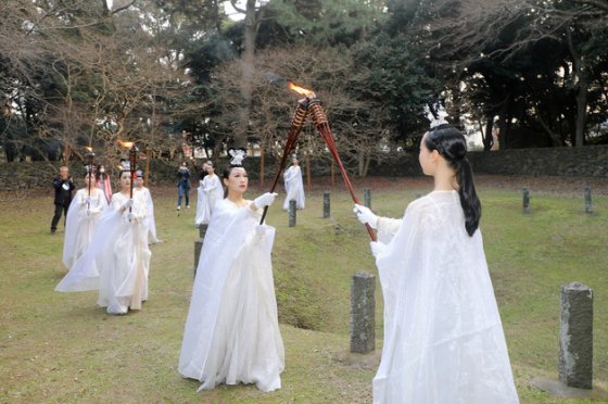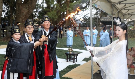 국내 최대 규모의 불놀이인 ‘2023 제주들불축제’ 첫날인 9일 오후 탐라국 개국신화가 깃든 제주시 이도1동 삼성혈에서 들불 불씨 채화제례가 봉행되고 있다. 2023.3.9. 뉴스1국내 최대 규모의 불놀이인 ‘2023 제주들불축제’의 서막이 올랐다.