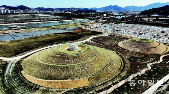 저류지(24만㎡)를 넓은 잔디밭으로 만든 오천그린광장 가장자리에는 백두와 한라 봉우리 두개가 있어 주변 경치를 한눈에 볼수 있다. 박영철 기자 skyblue@donga.com그랜아일랜드에서 약 5m 아래에는 24만5000㎡ 넓이의 잔디밭인 오천그린광장이 있다. 오천그린광장은 원래 100년 빈도로 발생하는 홍수를 대비하기 위한 재해예방시설인 저류지다. 저류지는 이번 박람회를 앞두고 시민들이 휴식을 즐기는 녹색광장으로 탈바꿈했다. 오천그린광장은 시민들의 쉼과 사색, 커뮤니티 공간이자 문화가 창출되는 소통의 자리기 될 것으로 기대된다.