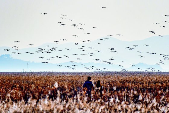 순천만은 지난해 11월 흑두루미 9841마리가 찾아 최고의 개체수를 기록했다. 흑두루미는 3월말이면 시베리아로 떠난다. 순천시 제공순천만의 3월은 북상을 준비하는 철새들로 분주하다. 순천만은 현재 흑두루미 3000여 마리, 큰기러기·쇠기러기·노란부리저어새 등 오리·기러기 2000여 마리가 여름을 나기 위해 시베리아 여행을 준비하고 있다. 3월 말이 되면 철새들이 모두 이동한다.