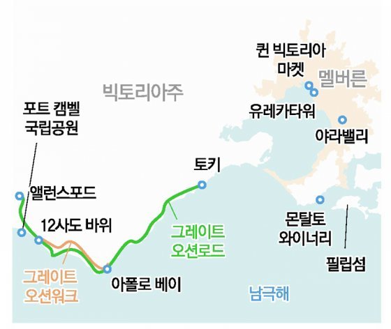 헬리콥터에서 바라본 그레이트오션로드 12사도상 바위.호주 멜버른에서 자동차로 약 2시간 거리에 있는 ‘그레이트오션로드’는 총 241km에 이르는 해안도로다. 주변에는 도보 트레일 코스인 ‘그레이트오션워크(Walk)’도 있다. 빅토리아주 어촌 마을인 아폴로베이에서 시작되는 100km 구간으로, 해안 절벽과 숲, 바위를 통과하며 바닷가의 절경을 감상할 수 있다. 트레일의 마지막 목적지는 ‘12사도 바위(Twelve Apostles)’다. 구불구불한 해안 절벽을 따라 서 있는 12사도 바위는 ‘죽기 전에 가봐야 할 전 세계 50곳’에 늘 거론되는 곳이다. 파도의 침식으로 석회암 12사도상이 하나둘씩 무너져 내리고 있기 때문이다. 실제로 포트캠벨 국립공원에 있는 ‘런던아치(런던브리지)’에 가보니 파도의 힘을 느낄 수 있었다. 런던아치는 1990년 1월 육지와 연결된 곶이었는데 파도의 침식으로 아치가 무너져 내려 섬이 됐다.