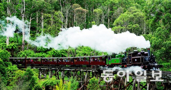 멜버른 외곽 단데농 국립공원 원시림 계곡에 놓인 100년이 넘은 목제 다리 위를 달려가는 퍼핑빌리 증기기관차.●필립섬에서 만난 펭귄과 블랙스완