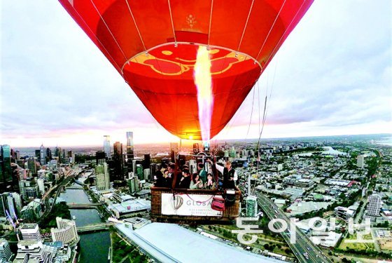 멜버른 도심 빌딩 위를 날아가는 열기구.오전 5시 50분. 멜버른 시내 중심가에 있는 호텔 앞으로 ‘글로벌 벌루닝(Global Ballooning)’이란 이름이 새겨진 승합차가 왔다. 차량은 멜버른 서쪽 야라강 하구 뉴포트파크에 멈춰 섰다. 풍선의 입구에 바람을 밀어넣고, 가스 불꽃을 뿜어대니 풍선이 똑바로 서기 시작한다. 고도가 높아지면서 점차 시야에 들어오는 항구의 컨테이너, 크루즈선, 도심의 빌딩 숲, 그리고 바다….