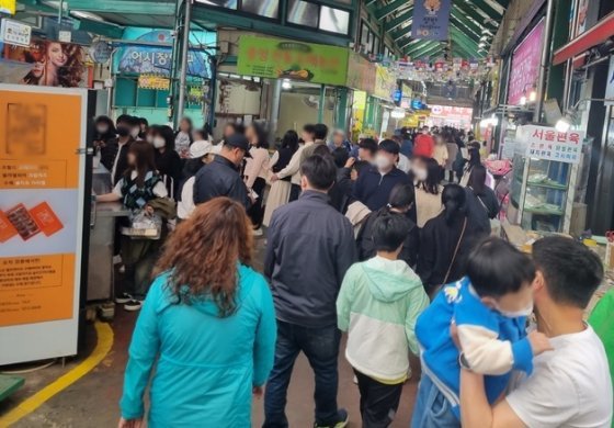 관광객들은 시장 명물인 닭강정을 한손에 들고 먹거리 코너를 이리저리 돌며 호떡, 고로케, 탕후루,전병 등 맛집투어를 즐겼다.