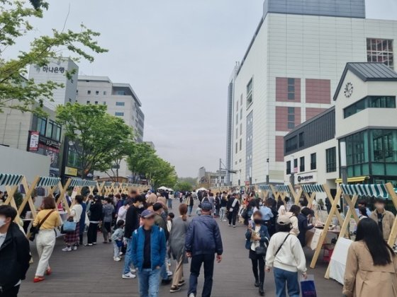 주말인 22일 강원 강릉월화거리에서 열린 ‘강릉산불 피해극복 응원 플리마켓’에 관광객들이 몰려 있다. 2023.4.22/뉴스1 강형석씨(57·경기)는 “마켓에 나온 꽃신이나 도예품 등이 너무 이뻐 머그컵 하나를 샀다”며 “산불 피해를 빨리 극복하길 바라는 마음으로 최대한 강릉에서 많이 소비하고 갈 것”이라고 말했다.