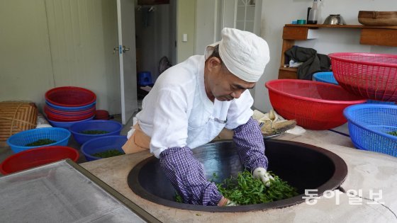 흥미로운 건 하동 차쟁이들 사이에서 올해 햇차가 유달리 뛰어나다고 자평한다는 점이다. 다우제다(다우찻집)의 이승관 대표는 “33년 전 녹차에 매료돼 직장을 때려치우고 하동 화개동에 들어왔을 때 맛본 차맛을 올해 드디어 찾아냈다”며 감격했다. 이 대표는 차의 품질을 결정짓는 데 절대적인 기술인 ‘전통 덖음’의 달인으로 통한다. 350~400도의 가마솥에서 오직 면장갑을 낀 양 손만을 사용해 어린 잎을 덖어내는 방법인데, 자칫 가마솥에 손을 데기가 십상인 고난도 기술이다. 이렇게 손만 사용해서 적절한 시간을 맞추어 찻잎을 덖어내야만 차맛을 제대로 구현해낼 수 있다는 게 30여 년 전 스승으로부터 배운 이 대표의 지론이다.