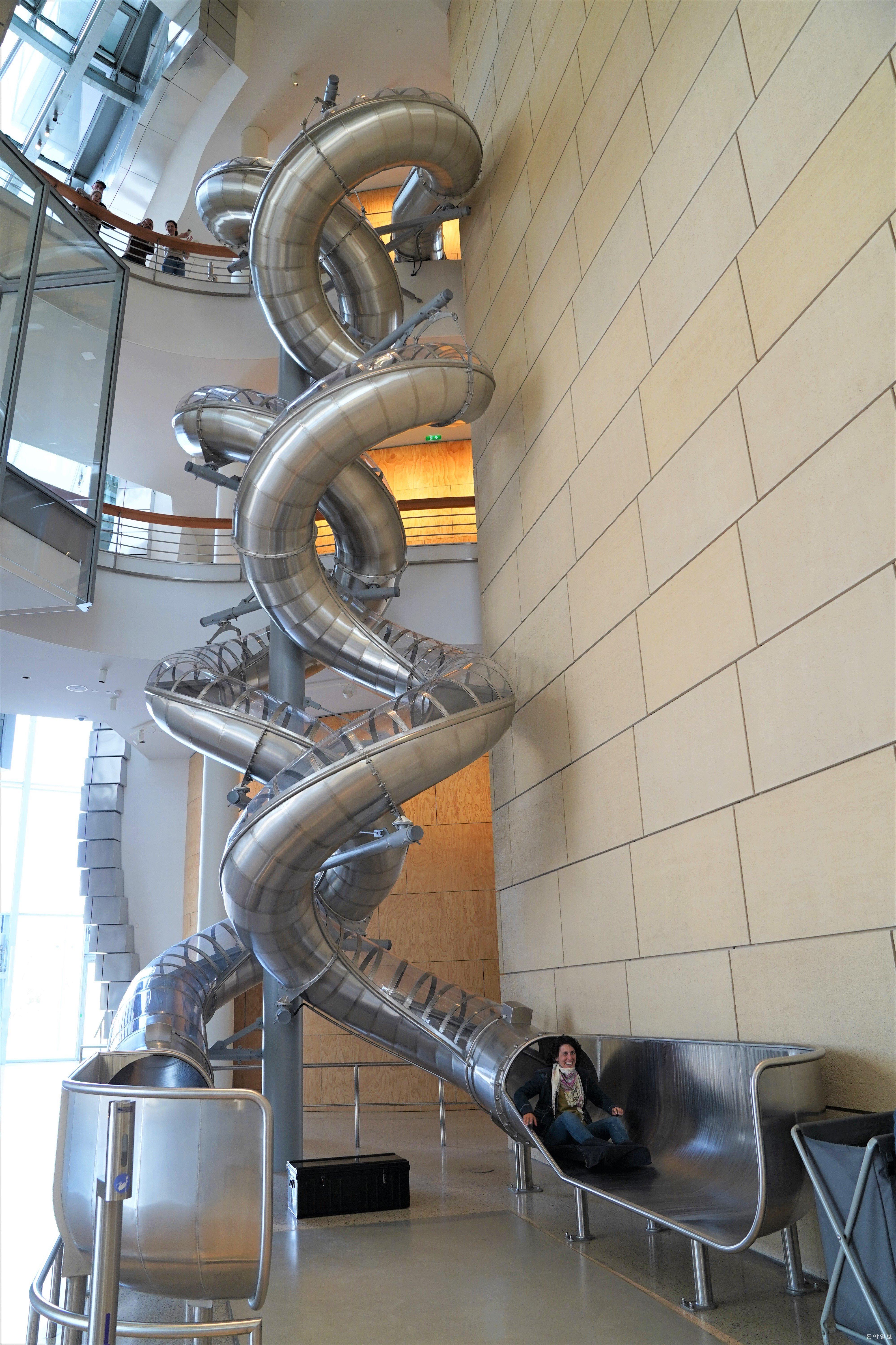 루마 아를 입구에서 표를 끊고 입장하면 로비가 나온다. 로비에서 사람들이 웃음소리가 끊이지 않는 곳은 2층에서 1층으로 내려올 수 있는 미끄럼틀이다. 벨기에 출신으로 스웨덴에서 활동 중인 작가 카르스텐 횔러(62)의 작품으로, 자치 엄숙해질 수 있는 미술관에 활기를 불어넣는 장치다.