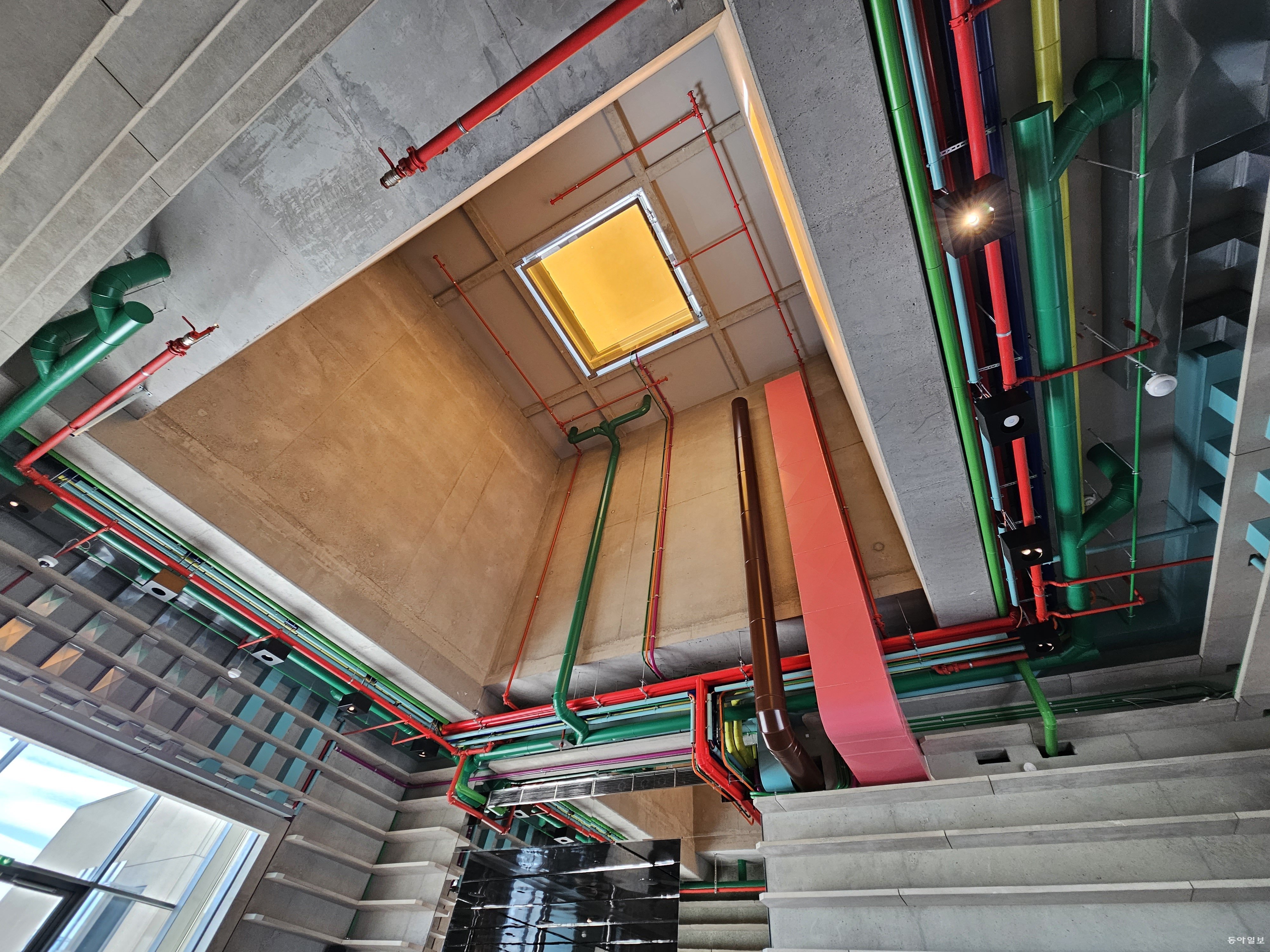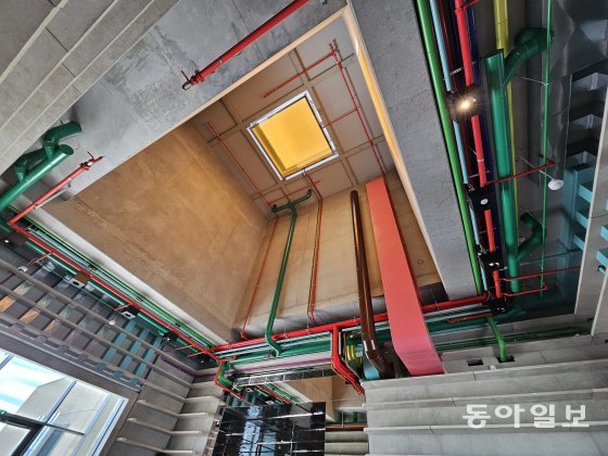 그랬더니 김치라기 보다는 소금에 절인 무 종류의 야채 샐러드가 들어가 있었다. 사방으로 탁 트인 유리창 전망이 좋은 드럼 카페는 천장 인테리어가 흥미로웠다. 빨강, 초록, 노랑 등의 각종 배관이 노출된 형태였는데, 마치 파리의 퐁피두센터 외관을 보는 듯한 느낌이었다.