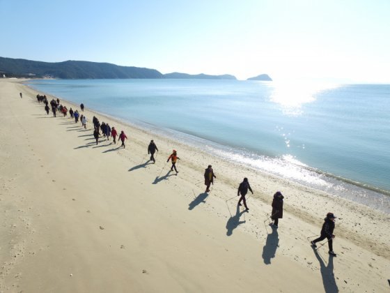 명사십리해수욕장은 친환경적이고 안전한 해수욕장에 부여하는 국제 인증인 ‘블루플래그’를 3년 연속 받았다. 해변 노르딕워킹은 등산 스틱을 양손에 쥐고 해안가를 거니는 것이다. 다리의 각도, 팔 동작 등 기본기를 다지며 해변을 걷다 보면 운동 효과가 일반 걷기보다 뛰어나다는 것을 몸으로 느낄 수 있다. 해변 요가와 필라테스도 남녀노소 누구나 쉽게 할 수 있는 운동이다. 꽃차 시음, 톳유부초밥·해초주먹밥 시식 등 연계 프로그램도 인기다.