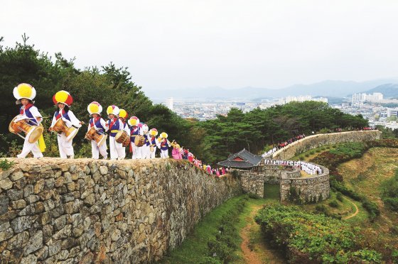전북 고창군의 대표 축제인 모양성제 참가자들이 고창읍성에서 답성놀이를 하고 있다. 전북도 제공27일 오후 7시 완월정 특설 무대에서 안숙선 판소리 명창과 가수 장윤정, 소명, 이찬원, 양지은, 김다현 등이 꾸미는 ‘춘향달빛콘서트’가 펼쳐진다.