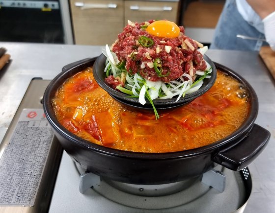 먼저 강진청자 육회 떡볶이다. 떡볶이가 끓는 시간 동안 고소한 한우 육회를 어느 정도 먹고 난 다음 남은 육회를 떡볶이에 그대로 부어 익혀 먹는 방식이다. 강진 쌀귀리로 떡을 만들고, 육회도 신선한 국내산을 사용했다. 떡볶이 국물과 함께 먹는 소고기 맛이 일품이다. 육회와 떡볶이를 동시에 즐길 수 있어 MZ세대의 발길이 이어지고 있다.