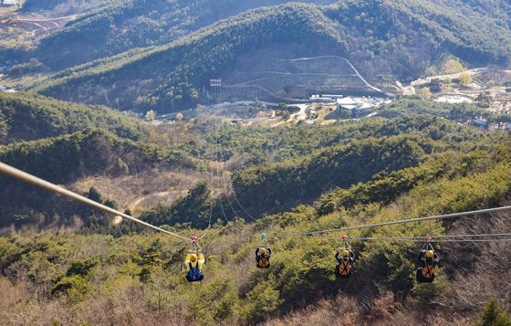 지리산정원의 스카이런은 국내 짚라인 체험 시설 가운데 최고 경사율을 자랑한다. 구례군 제공