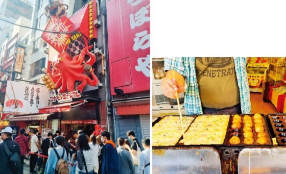 우선 1년 365일 사람들로 북적이는 도톤보리로 향하자. 도톤보리에 도착하면 명물 ‘글리코 간판’ 앞에서 인증숏부터 찍자. 글리코는 과자류를 만드는 곳인데, 회사 마스코트 격인 마라토너의 네온사인 간판이 도톤보리강을 중심으로 가장 잘 보이는 곳에 위치해 있다. 글리코 간판을 시작으로 가니도라쿠(대게 집) 간판과 초밥집 간판들이 화려하게 반짝이며 이색적인 분위기로 여행객의 눈길을 사로잡는다. 지하철 미도스지선 난바역과 신사이바시역 사이 지역을 ‘미나미’(난바-도톤보리-신사이바시)라고 부른다. 현지인도 이곳에서 외식과 쇼핑을 많이 하는데, 난바에서부터 도톤보리까지 이어지는 상점가에서는 음식 천국의 중심지로 불릴 만큼 다코야키, 꼬치구이, 라멘 등 오사카가 자랑하는 전통 먹거리를 모두 맛볼 수 있다. 반면, 신사이바시에는 명품 브랜드들이 입점한 백화점·면세점·대형쇼핑몰부터 SPA 브랜드까지 자리해 다양한 가격대의 물품을 구매할 수 있다. 한국에서 구하기 힘든 최신 유행 디자인의 아이템도 많으니 꼭 방문해보자.