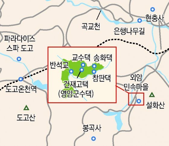 외암마을 전경. 돌다리(오른쪽 위)가 놓인 물길이 반계천이다.아산시 송악면 외암민속마을 입구에는 사람들의 눈길을 끄는 널따란 석각(石刻)이 있다. 마을 진입로인 돌다리(반석교) 아래쪽 암반에 새겨진 ‘외암동천(巍巖洞天)’과 ‘동화수석(東華水石)’이라는 글씨다. 외암동천은 외암마을이 신선들이 사는 별세계임을 뜻하고, 동화수석 역시 물과 돌이 어우러져 선계(仙界)처럼 아름다운 공간임을 의미한다. 도교 용어인 ‘동천’ ‘동화’는 보통 세속과 떨어진 채 아름다운 산수가 펼쳐지는 곳을 가리킨다. 그런데 외암마을은 사람들의 일상생활 공간을 버젓이 ‘동천’이라고 내걸고 있다. 신선이 머물 정도로 살기 좋은 마을이라는 자부심 때문일 것이다.