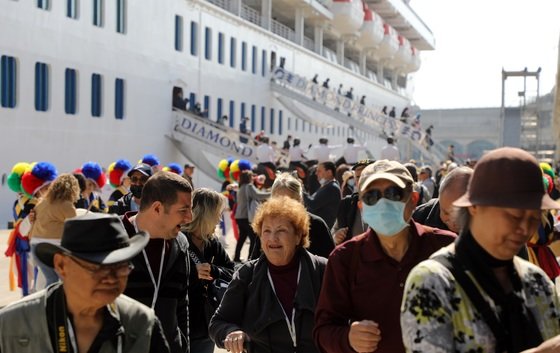 19일 오전 제주 서귀포시 강정민군복합형관광미항에 일본 가고시마에서 출발한 초대형 크루즈선 다이아몬드 프린세스호(11만톤급)가 입항해 승객들이 하선하고 있다. 강정항에 국제크루즈선이 입항하는 것은 2019년 이후 3년 10개월 만이다.2023.3.19/뉴스1 ⓒ News1 고동명 기자제주를 찾은 외국인관광객이 3년만에 20만명 돌파를 눈앞에 두고 있다.