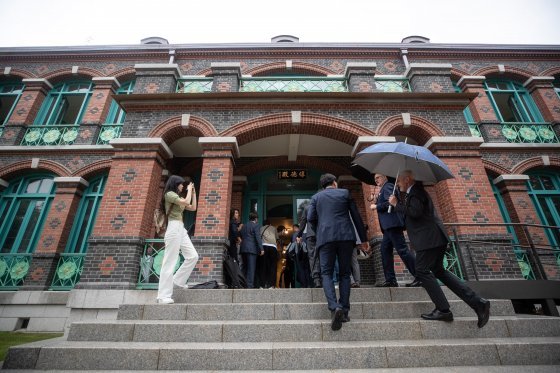 100년 만에 재건된 서울 중구 덕수궁 돈덕전에 영국 독일 등 12개 나라 외교관 및 인플루언서들이 26일 초청돼 들어가고 있다. 뉴스1“환영합니다. 여러분은 재건된 돈덕전(惇德殿)에 초청된 첫 손님입니다.”
