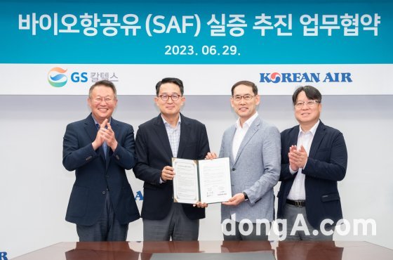 대한항공은 29일 서울 강남구 소재 GS타워에서 GS칼텍스와 ‘바이오항공유 실증연구 운항을 위한 업무협약(MOU)’을 체결했다. 협약식에는 조성배 대한항공 자재 및 시설부문 총괄 전무와 김창수 GS칼텍스 부사장 등 주요 관계자들이 참석했다.