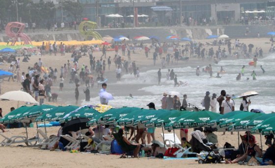 부산 지역에 올해 첫 폭염주의보가 발효된 2일 해운대구 해운대해수욕장을 찾은 피서객들이 물놀이를 즐기고 있다. 장마가 잠시 멈추고