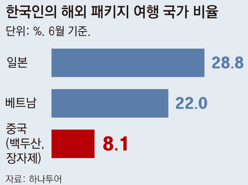 최근 일본 관광 열풍 속에서도 중국 여행 역시 조용한 회복세를 보이고 있다. 하나투어는 6월 패키지여행 상품 인기 국가로 일본, 베트남에 이어 중국이 3위(8.1%)라고 밝혔다. 5월 중국 정부가 단체 관광의 비자 제한을 완화하자 백두산 인근, 장자제(張家界)와 같은 전통적 관광지를 중심으로 예약이 이루어지며 한국을 출발한 송출객 수가 전월 대비 150% 늘었다. 하나투어는 7, 8월 패키지 예약에서 중국 여행객 비중이 코로나19 확산 전 수준(약 15%)으로 회복될 것으로 예상하고 있다.