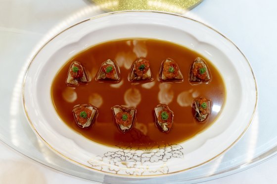 이 중 지방이 적고 육질이 좋은 거위를 골라 리치 열매 나무로 구운 요리가 유명하다. 겉은 바삭하고 속은 육즙이 풍부하다. 구운 돼지고기와 새우 및 캐비아를 조합한 요리, 20년 숙성된 황주(중국 전통 술)로 풍미를 더한 랍스터, 가리비를 토란으로 감싸 튀긴 딤섬, 매콤새콤한 산라탕 등을 맛볼 수 있다. 티 소믈리에가 40여 가지의 특선 차를 준비해 각 음식과 조화를 이루는 차를 함께 제공한다.