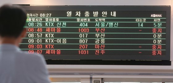 19일 오전 서울역 열차출발안내 전광판에 집중 호우로 인해 무궁화호, 새마을호 등 일반열차 운행와 KTX 운행 중지 안내문이 나오고 있다. 코레일은 “집중호우로 약화된 지반을 재점검하고 운행 안전이 확실시될 때까지 열차 운행을 조정할 것”이라고 전했다. 2023.7.19/뉴스1한국철도공사(코레일)가 집중 호우로 감속 운행했던 KTX 운행 속도를 오는 20일부터 정상화할 계획이다.