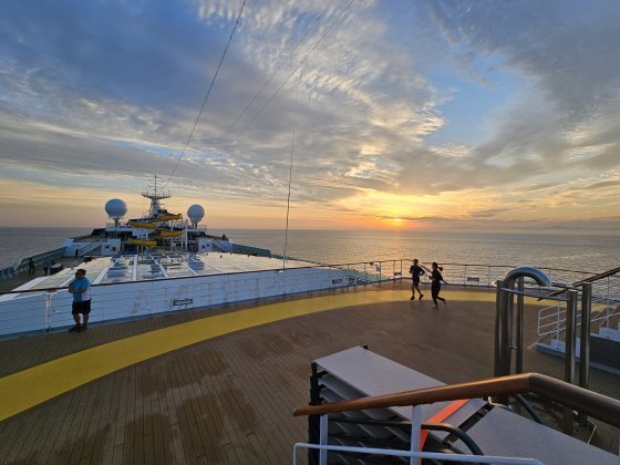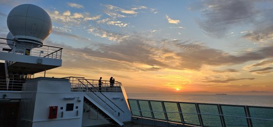 부산항에서 일본 규슈 지방을 여행하는 코스타세레나호의 선상에서 감상하는 대한해협의 일출. 크루즈 갑판 위의 조깅코스에서 한 커플이 떠오르는 태양을 배경으로 아침 조깅을 즐기고 있다.●크루즈 선내에서 100배 즐기기