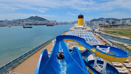 크루즈 갑판 위 수영장에 설치돼 있는 워터 슬라이드.크루즈 여행의 특징은 직접 운전하거나 대중교통을 타고 관광지를 찾아갈 필요도 없고, 숙소를 고르고, 식당을 찾아 헤맬 필요도 없다. 갑판 위에서 해가 떠오르는 모습을 바라보며 조깅을 하고, 밤에는 달과 별을 구경하기도 한다. 바다가 보이는 야외 수영장에서 설치돼 있는 워터슬라이드를 타고 물 속으로 풍덩 빠지는 것도 이색적인 경험이다.