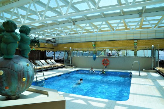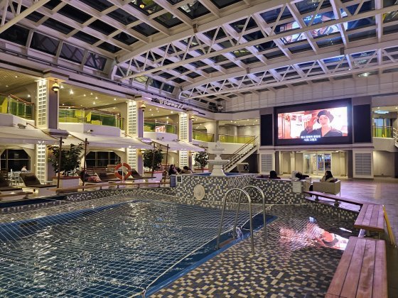 코스타세레나호의 8개의 수영장 중 하나. 날씨가 좋을 때는 개폐식 지붕을 개방한다.크루즈 여행에 온 사람들은 부모님 환갑, 칠순을 맞아 형제, 자매가족끼리 온 사람도 있고, 동창회와 향우회, 동호회원들끼리 단체로 여행을 온 사람들이 많았다. 세 형제가 가족들과 함께 여행 온 김현수 씨(52)는 “가족끼리 여행을 해봤어도 이렇게 많은 대화를 한 것은 처음”이라며 “한 배를 타고 여유있게 함께 할 수 있다는 것이 크루즈 여행의 묘미”라고 말했다.
